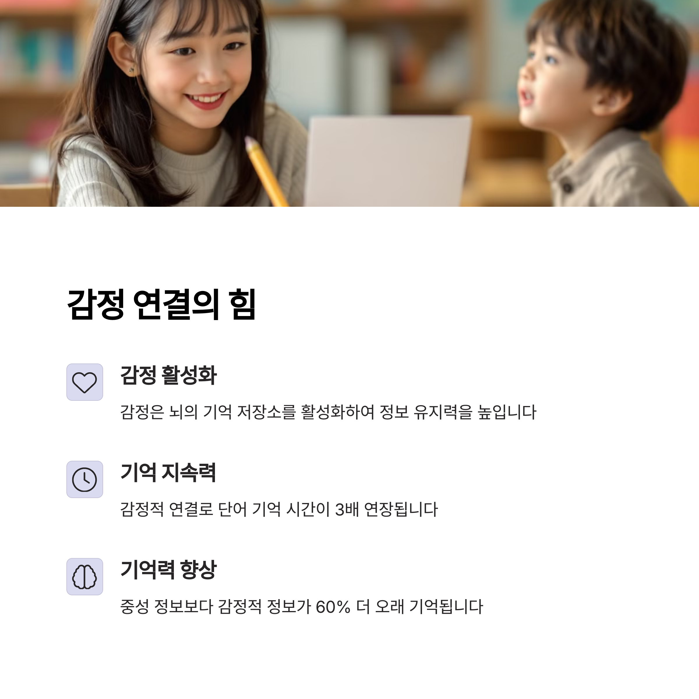 | 감정 자극이 기억을 오래 유지시켜 줍니다. | 단어를 이미지로 연결하면 더 오래 기억됩니다. | 반복 간격을 조절해 학습 효율을 높입니다. |