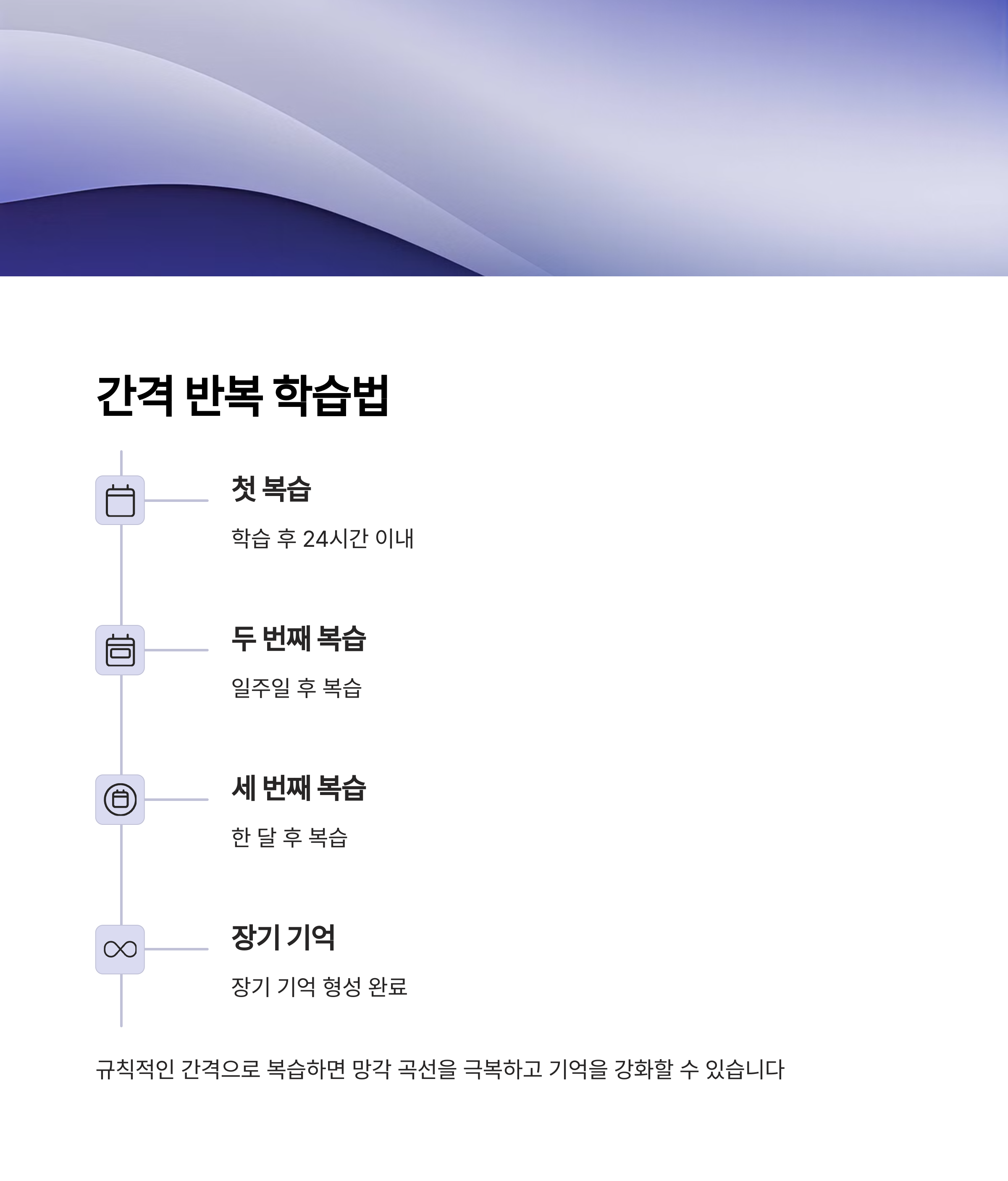 | 재미있는 이야기와 연결해 보세요. | 실제 장면을 떠올리는 연습이 중요합니다. | 복습 주기를 달력에 표시해보세요. |