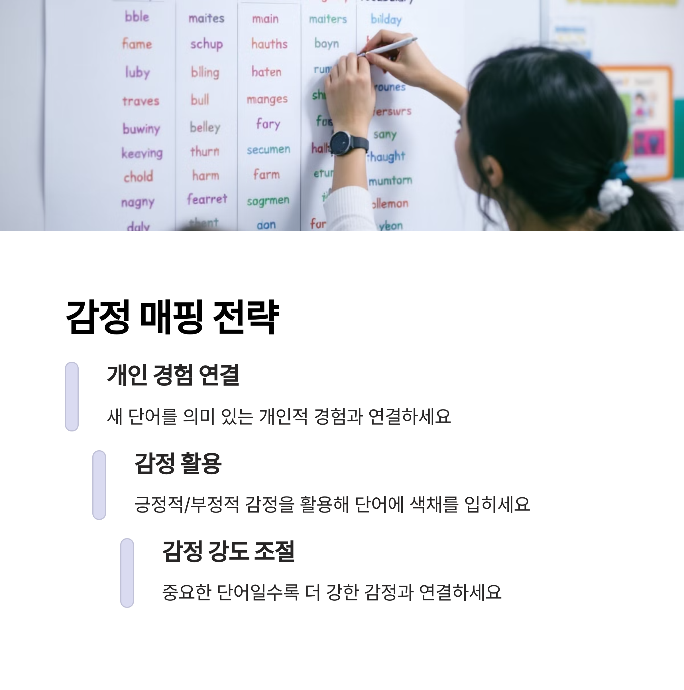 | 감정 연결 기억법 | 감정을 담아 단어를 외우면 기억이 오래 갑니다. |
