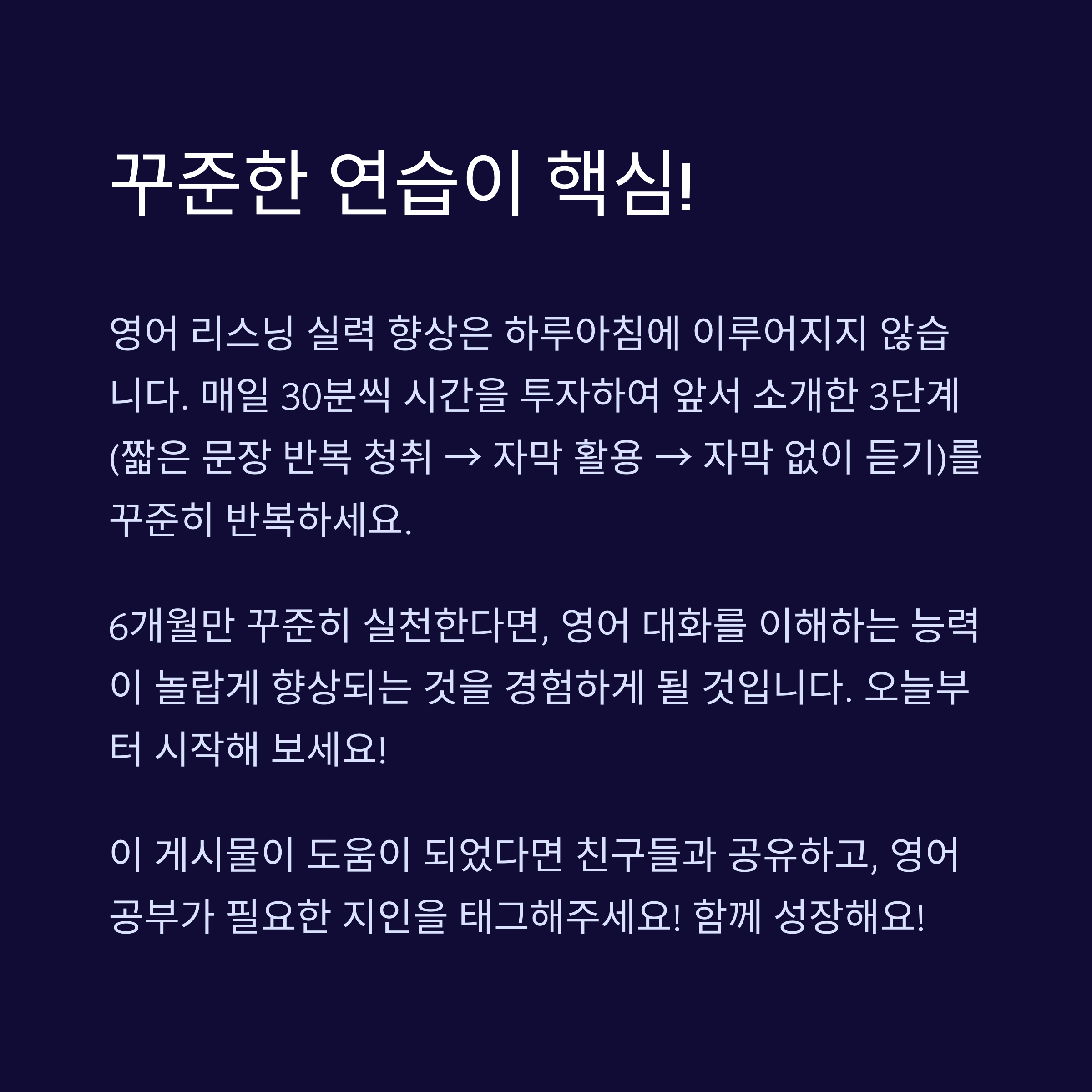 리스닝 실력을 기르는 데 있어 중요한 것은 단계별 접근과 반복 훈련입니다. 단기간에 실력이 확 오르진 않지만, 꾸준히 루틴을 지켜나간다면 분명한 변화를 느낄 수 있습니다. 오늘 소개해드린 순서를 따라 매일 조금씩 실천해보세요. 듣기는 단순한 기술이 아닌 습관입니다. 여러분의 꾸준함이 결국 영어 실력 향상으로 이어질 것입니다. 오늘도 작은 루틴 하나가 큰 차이를 만들어낼 수 있다는 점, 꼭 기억해 주세요.