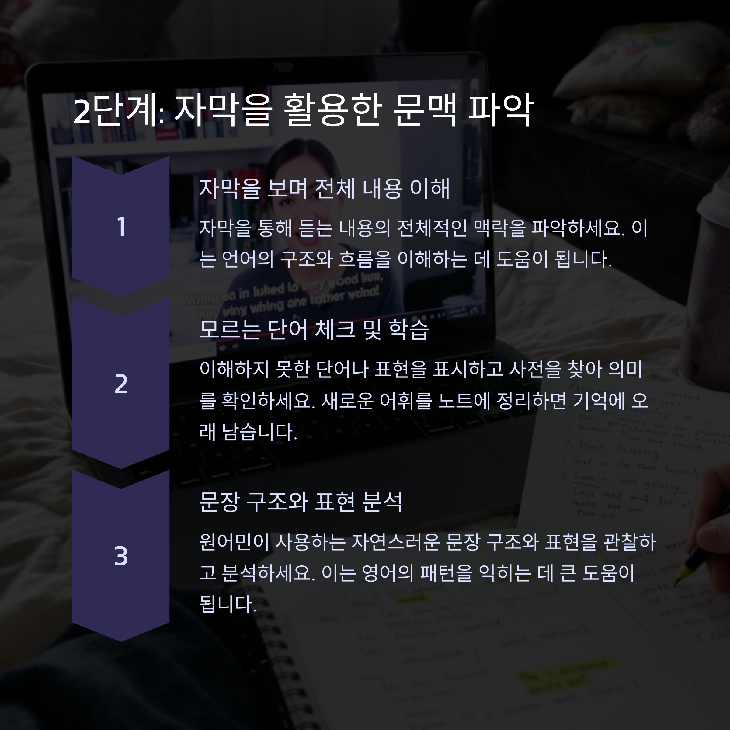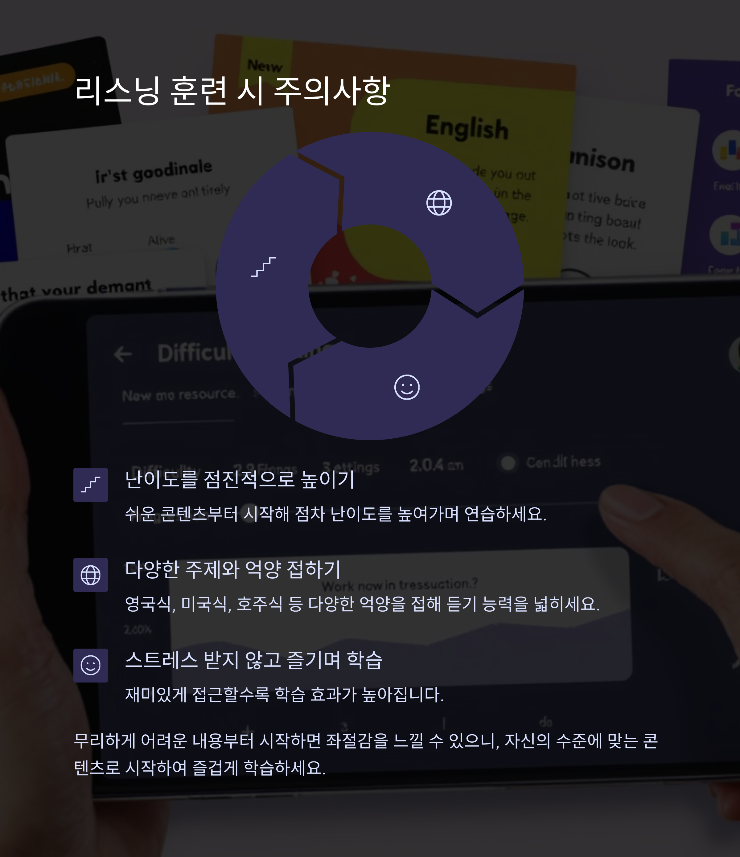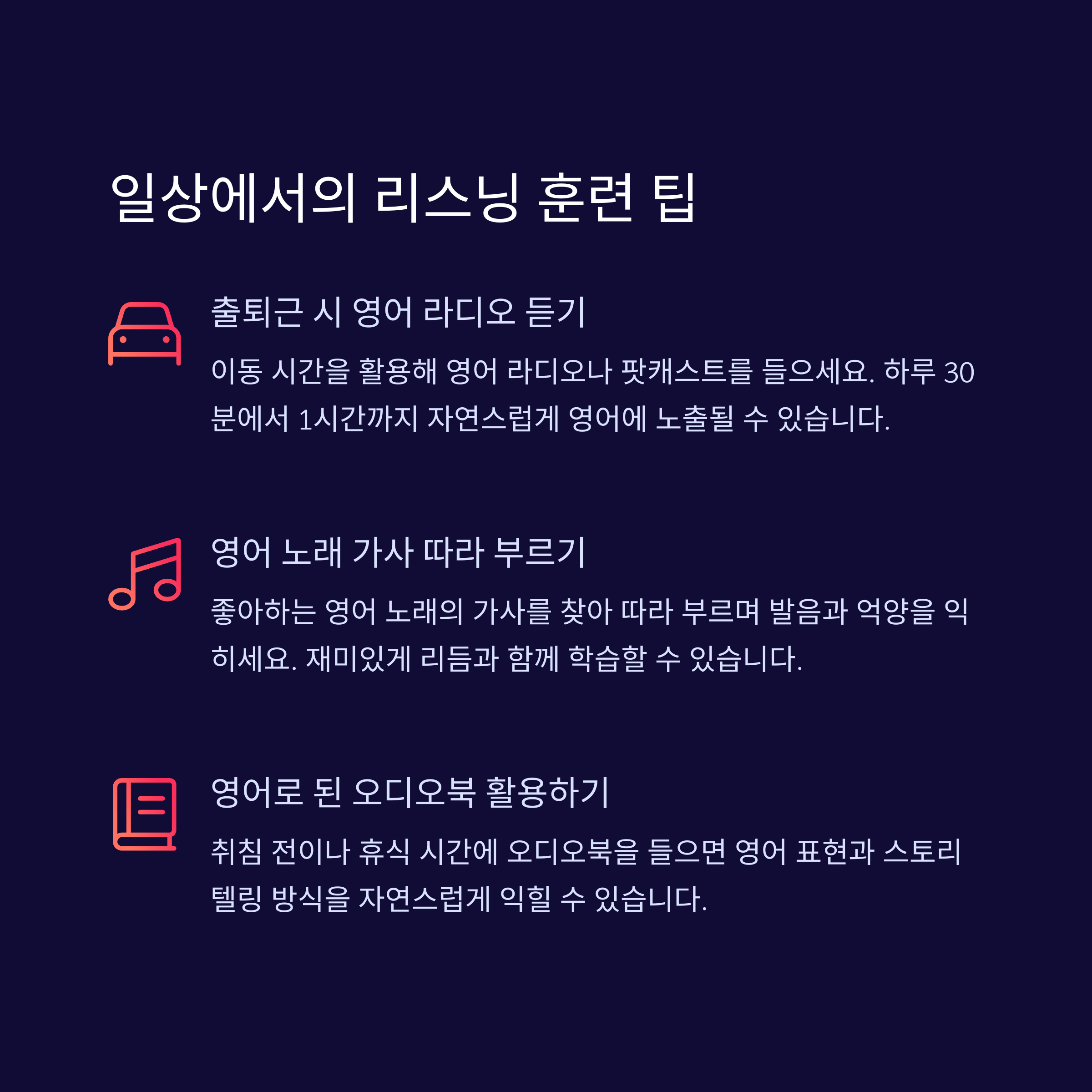 짧은 문장을 반복해서 들으며 억양 익히기 자막과 함께 문맥 이해하며 듣기 연습 자막 없이 의미 파악하며 실전 훈련