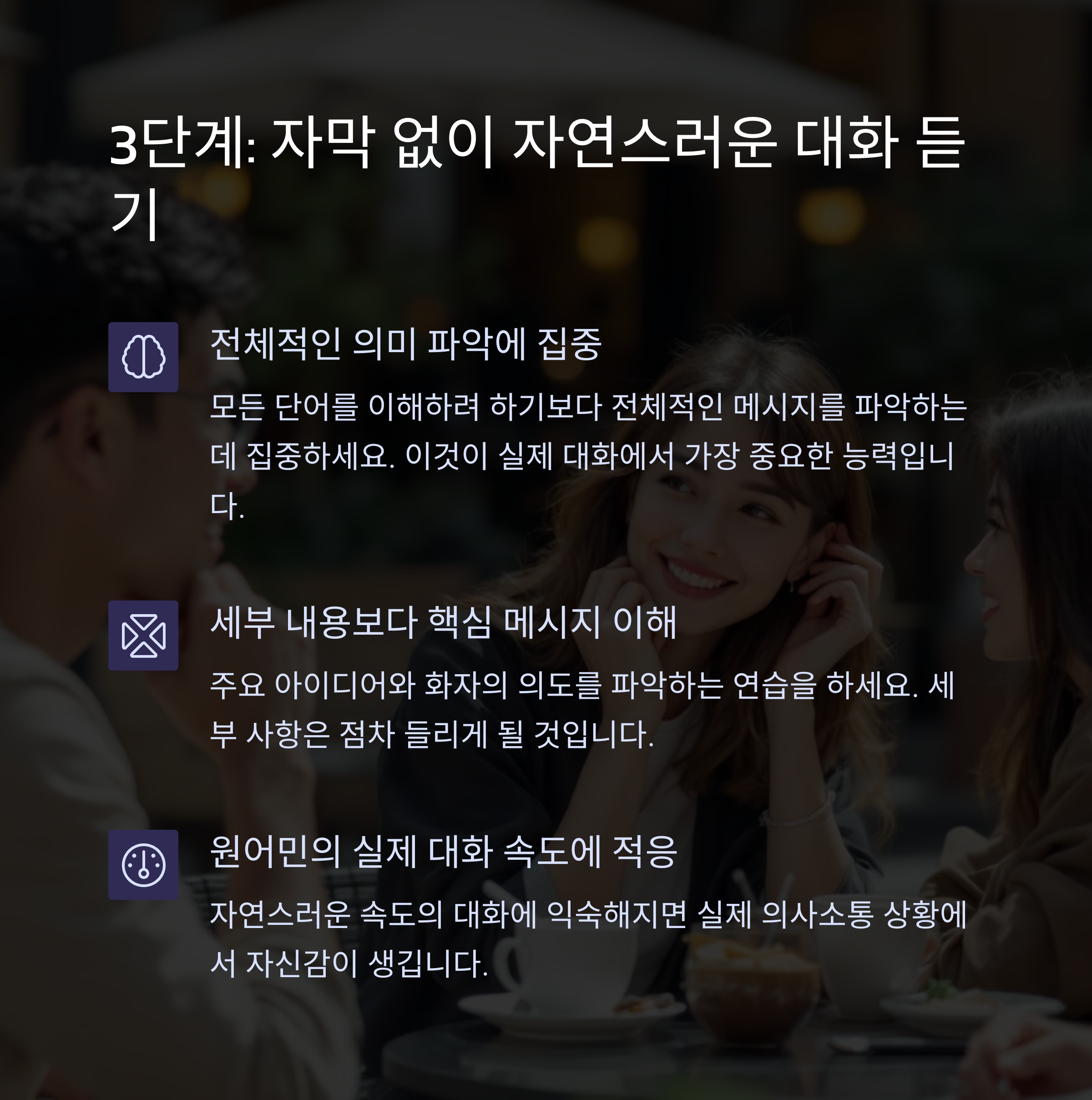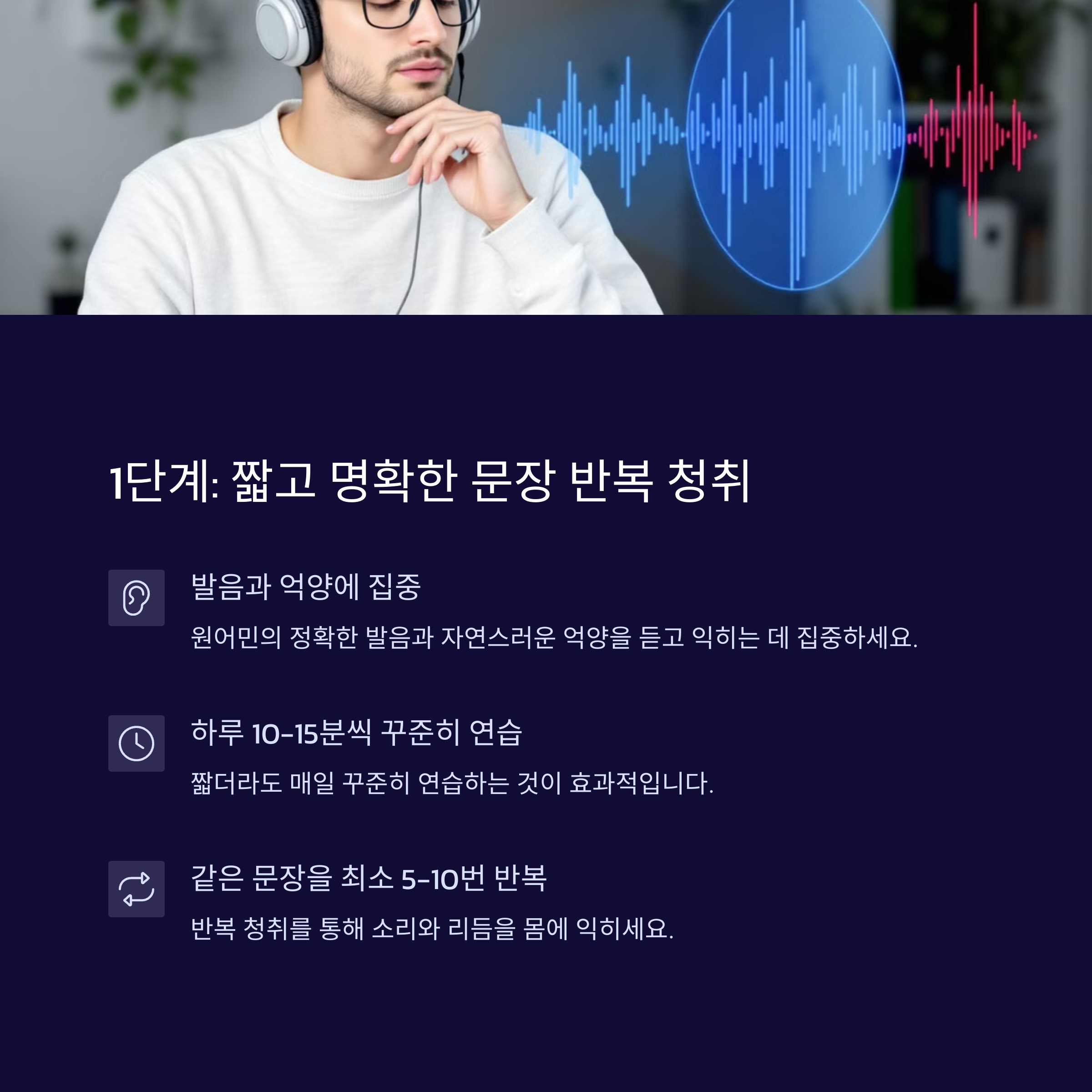 | 짧은 문장을 반복해서 들으며 억양 익히기 | 자막과 함께 문맥 이해하며 듣기 연습 | 자막 없이 의미 파악하며 실전 훈련 |