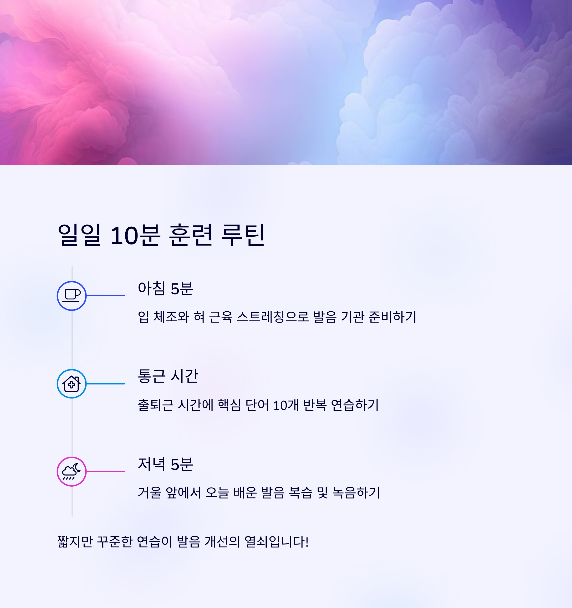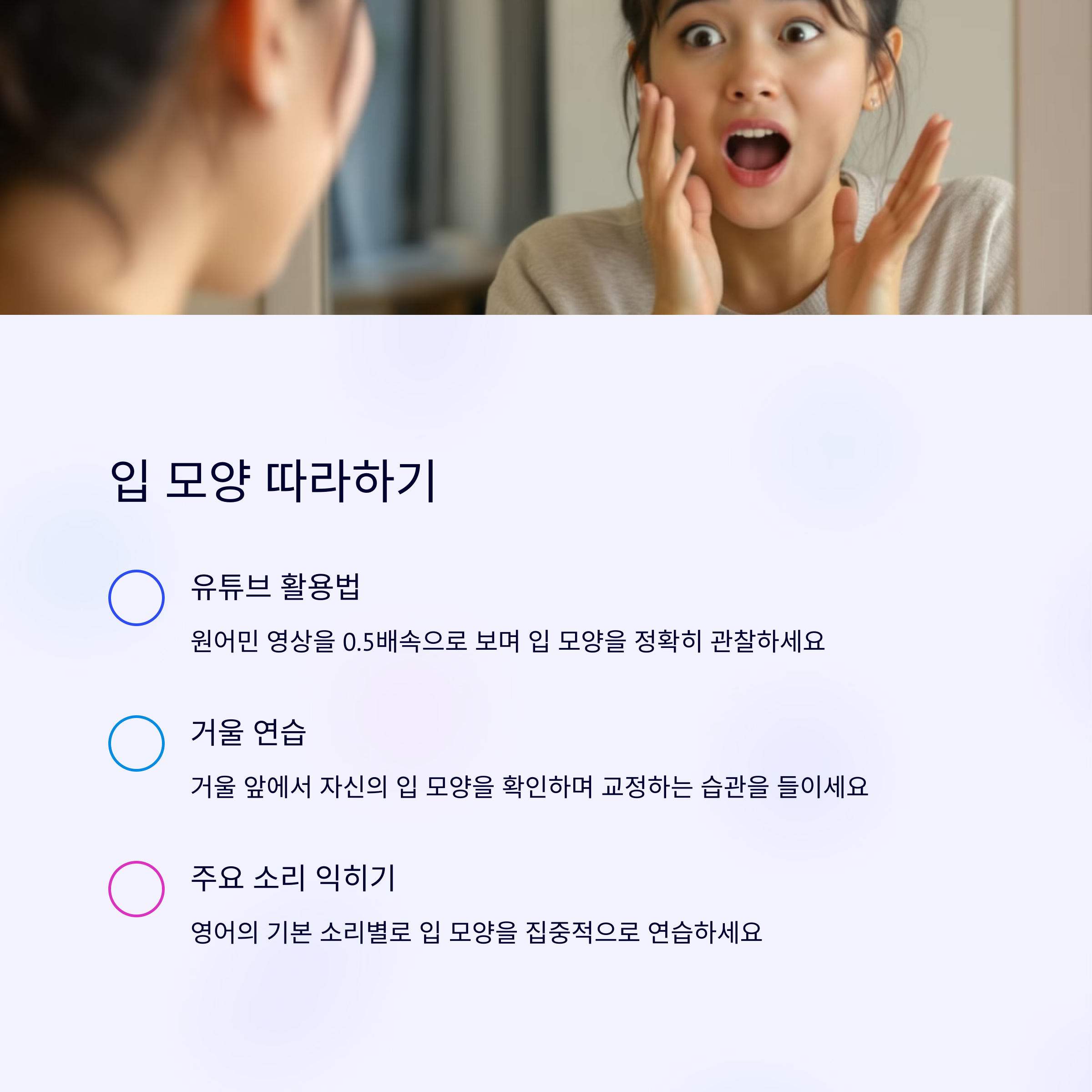 거울 앞에서 입모양 따라하며 연습해요 유튜브 원어민 영상으로 억양과 리듬 익혀요 매일 10분만 실천해도 눈에 띄게 달라져요