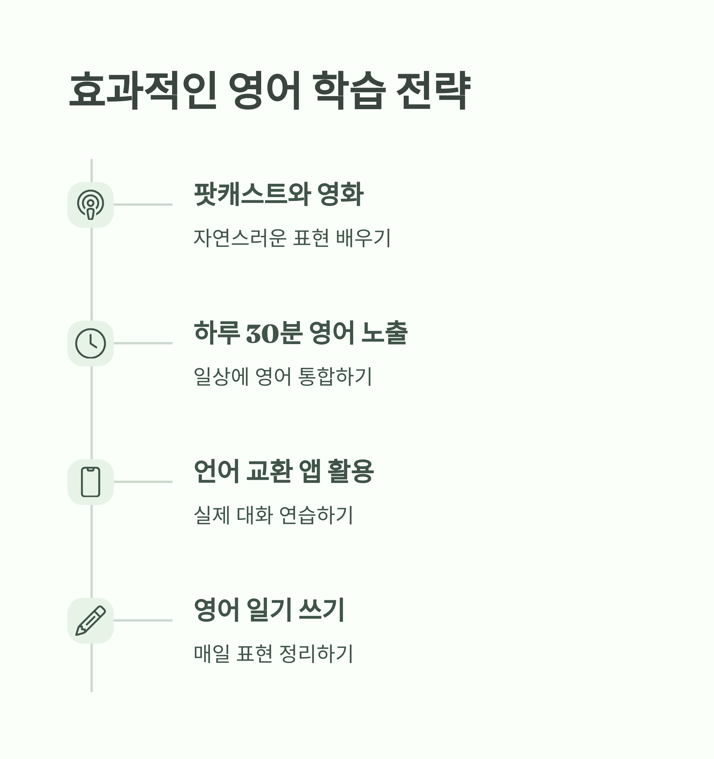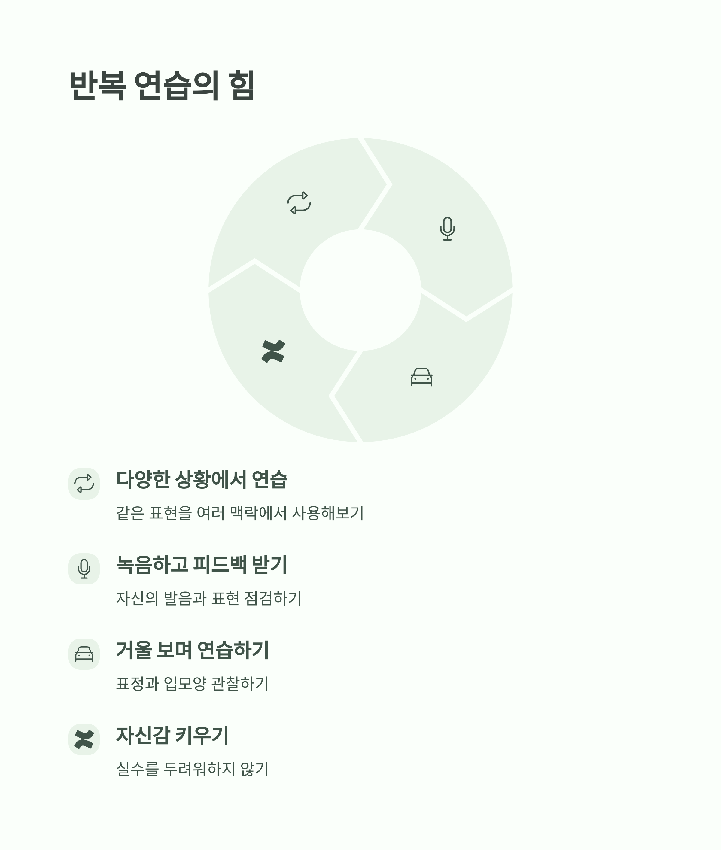 실생활 영어를 익히는 핵심은 반복과 실전입니다. 아침마다 거울 앞에서 한 문장씩 말해보는 루틴도 효과적입니다. 또한 메모장이나 스마트폰 앱에 매일 표현 하나씩 적고, 직접 말해보는 것도 좋은 방법이에요. 중요한 것은 외우는 게 아니라 '익숙해지는 것'입니다.