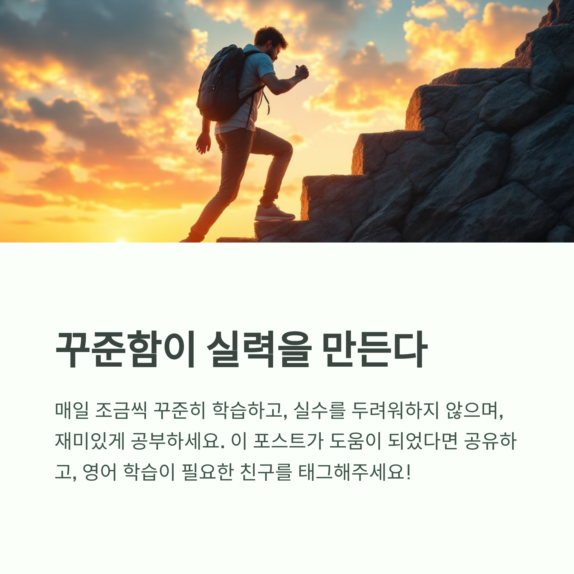 오늘 소개해드린 실생활 영어 표현들은 단순히 외워야 할 문장 그 이상입니다. 여러분이 실제로 마주하는 다양한 상황 속에서 자연스럽고 매끄럽게 의사소통을 할 수 있도록 도와주는 도구이죠. 꾸준히 익히고 반복하는 것만으로도 영어 실력은 한 단계 업그레이드됩니다. 영어는 단기간에 마스터하기 어려운 언어지만, 그만큼 매일의 노력과 노출이 쌓이면 분명히 성장하게 되어 있습니다. 오늘의 표현들로 실생활 영어에 자신감을 더해보세요!