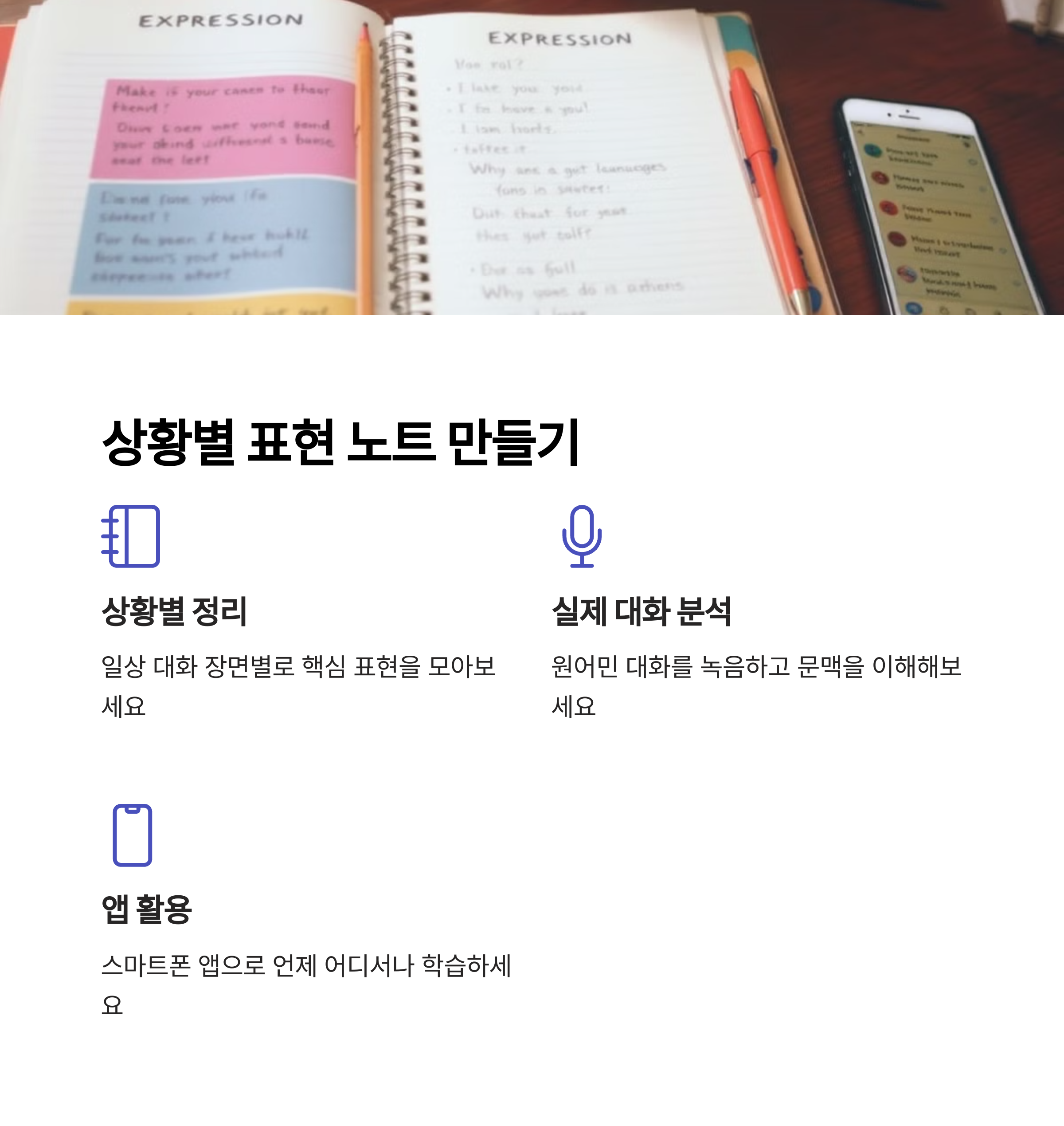 | 원어민처럼 말하는 자연스러운 일상 표현 익히기 | 영어 표현을 직역 대신 감각적으로 익히는 사고 훈련 | 자신만의 영어 표현 정리 노트를 만들어 연습하기 |