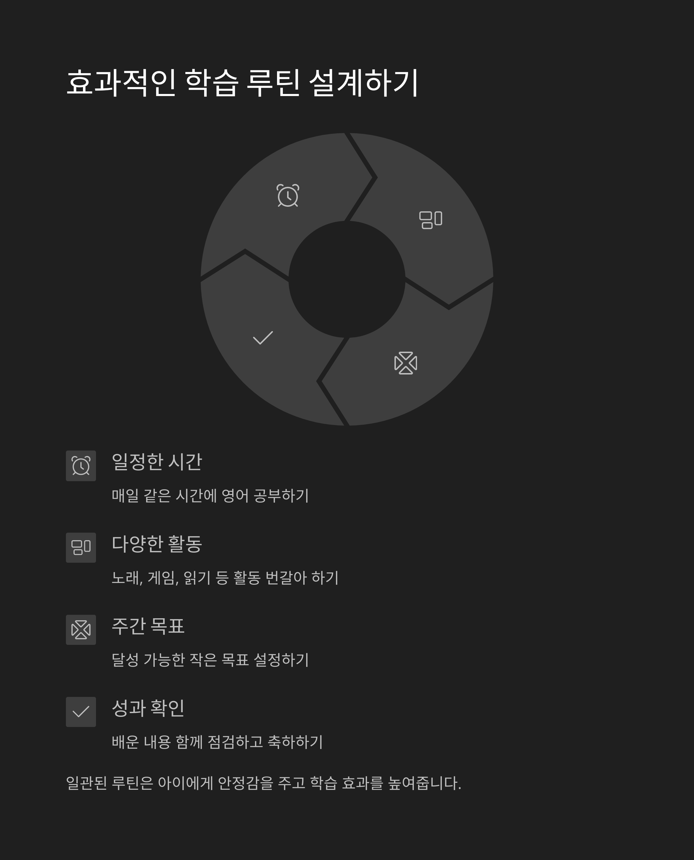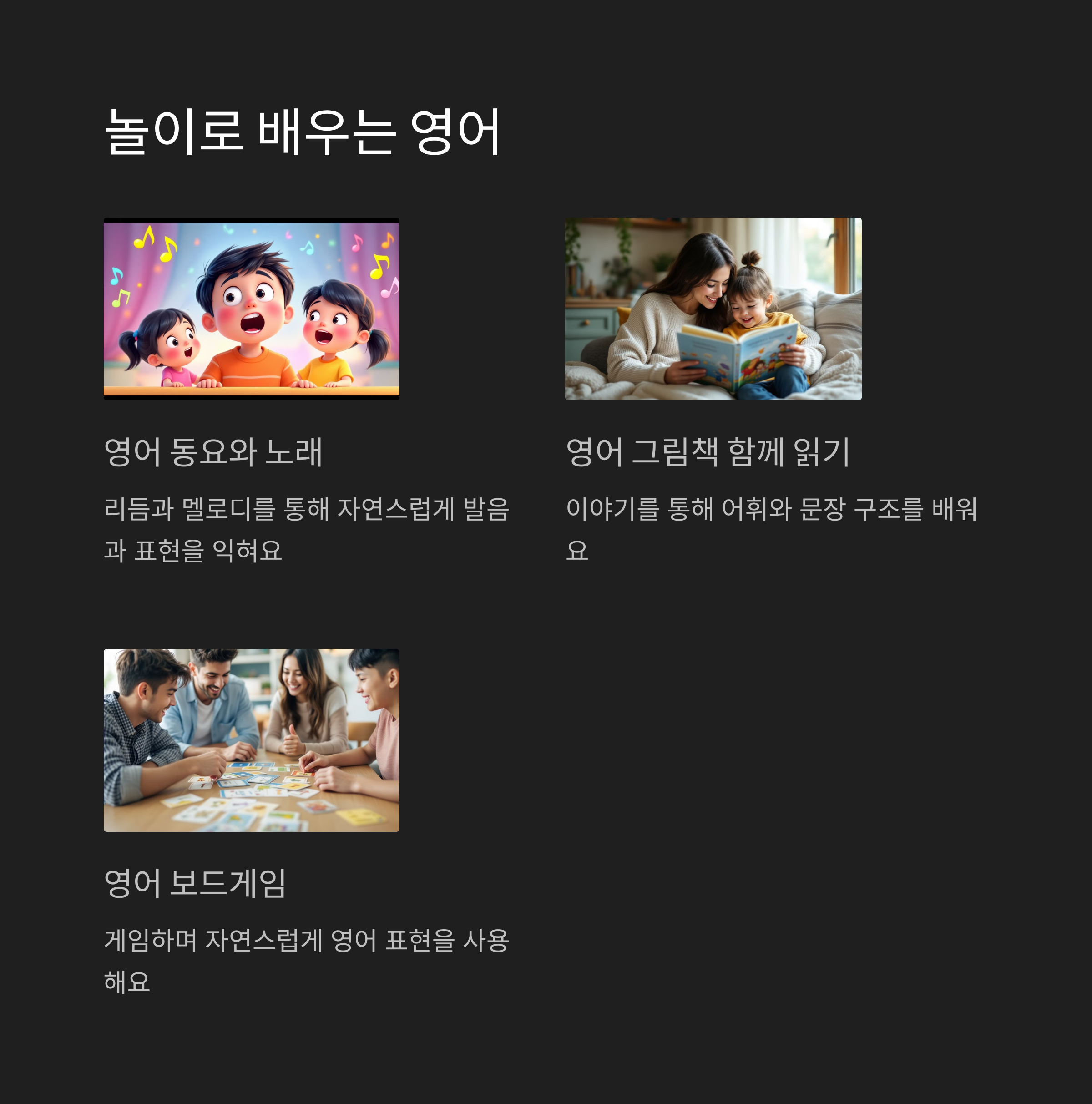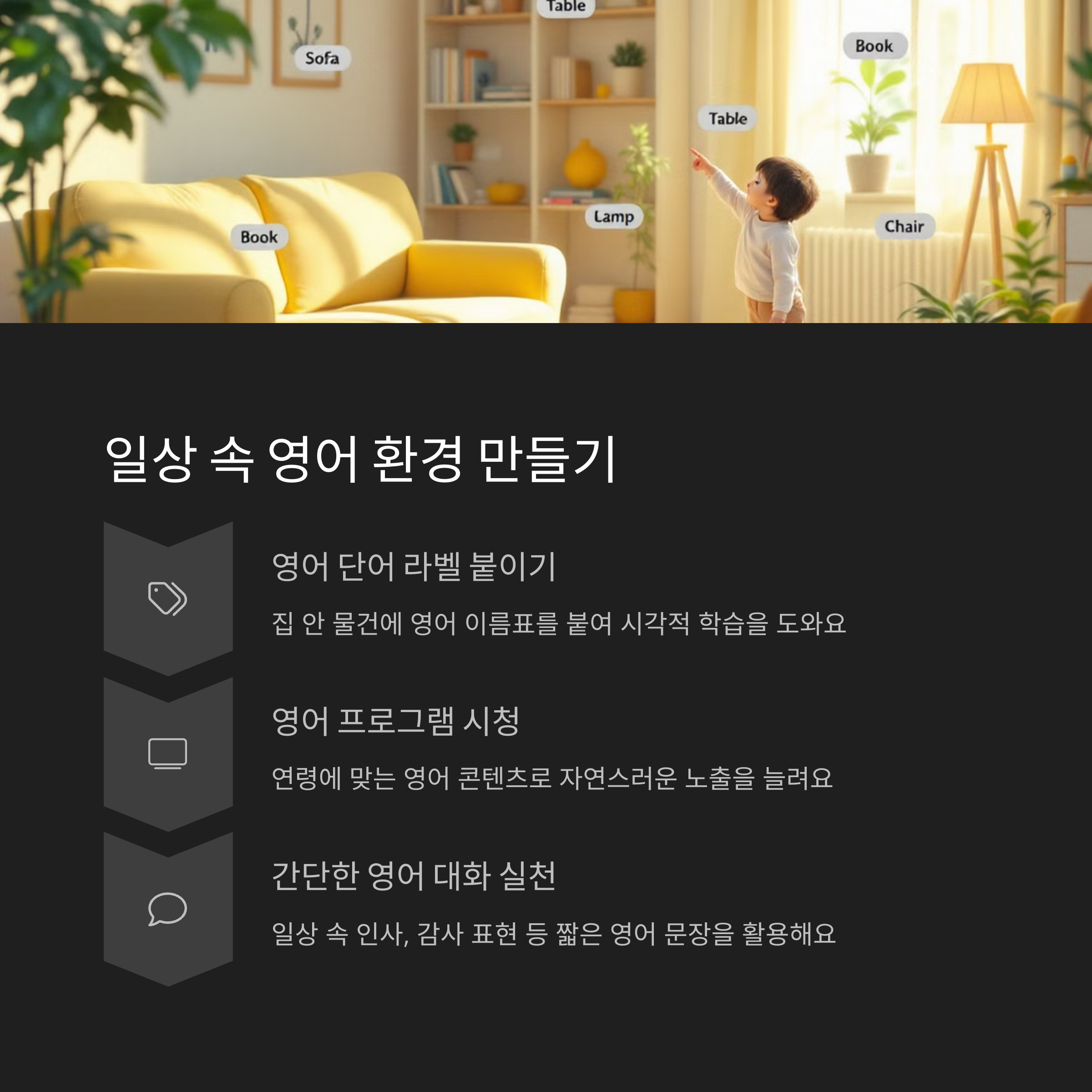 | 한 권을 반복해서 읽으며 단어를 익히게 합니다. | 놀이와 학습을 자연스럽게 결합해 루틴을 유지합니다. | 일상 표현을 영어로 자주 말해보는 것이 좋습니다. |