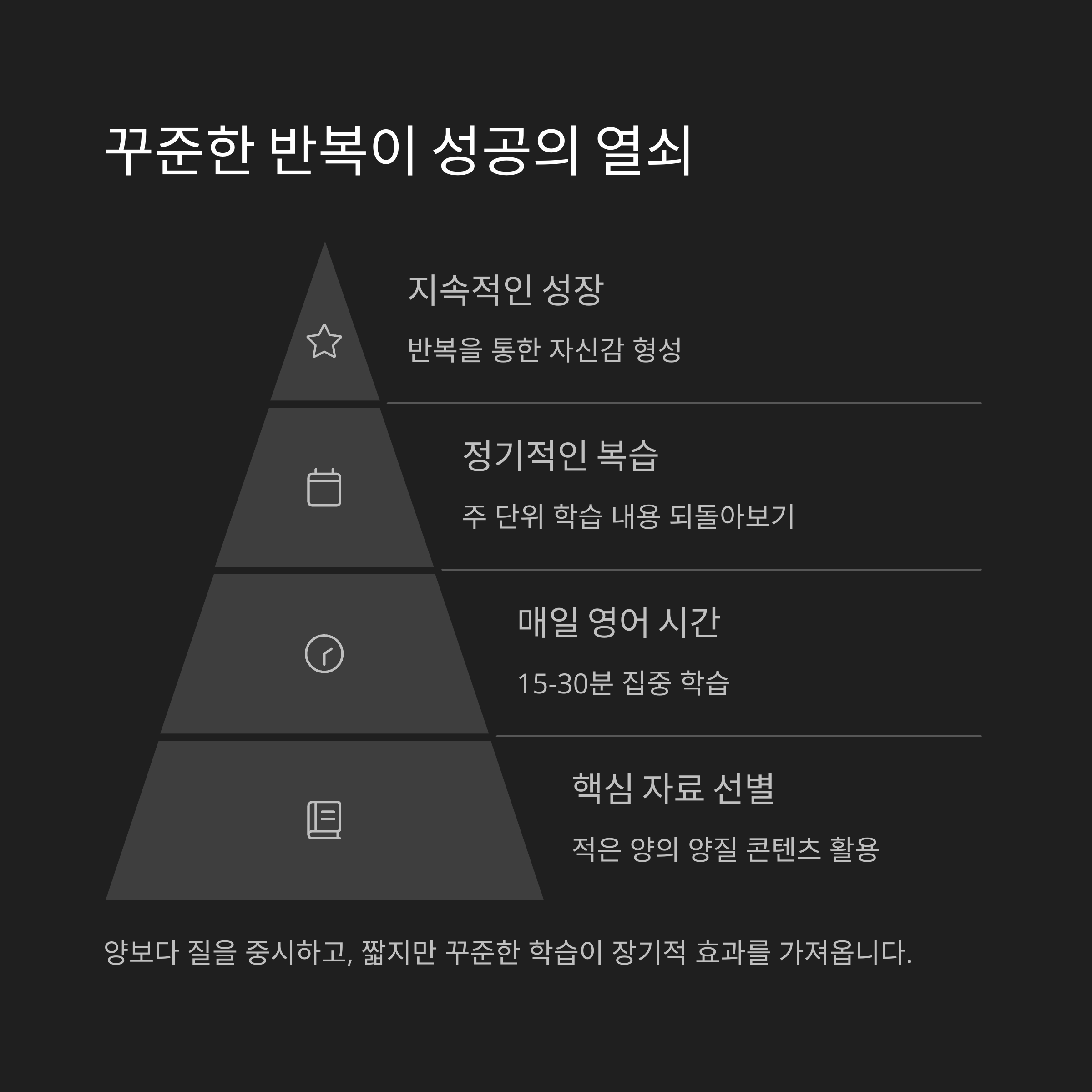 홈스쿨링에서 가장 흔한 실수는 '너무 많은 자료를 한꺼번에 도입'하는 것입니다. 아이는 아직 모든 것을 받아들일 준비가 되어 있지 않기 때문에, 단계별 접근과 반복이 중요합니다. 한 권의 그림책을 반복해서 읽거나, 하루에 한 가지 표현만 반복하는 것이 때로는 수십 개의 단어를 가르치는 것보다 더 효과적입니다. 부모님은 아이가 어느 순간 자연스럽게 단어를 말하게 되는 모습을 보며 꾸준함의 가치를 체감하게 될 것입니다. 또한 아이가 좋아하는 주제를 중심으로 영어를 접하게 하면 흥미와 지속성이 훨씬 높아집니다.