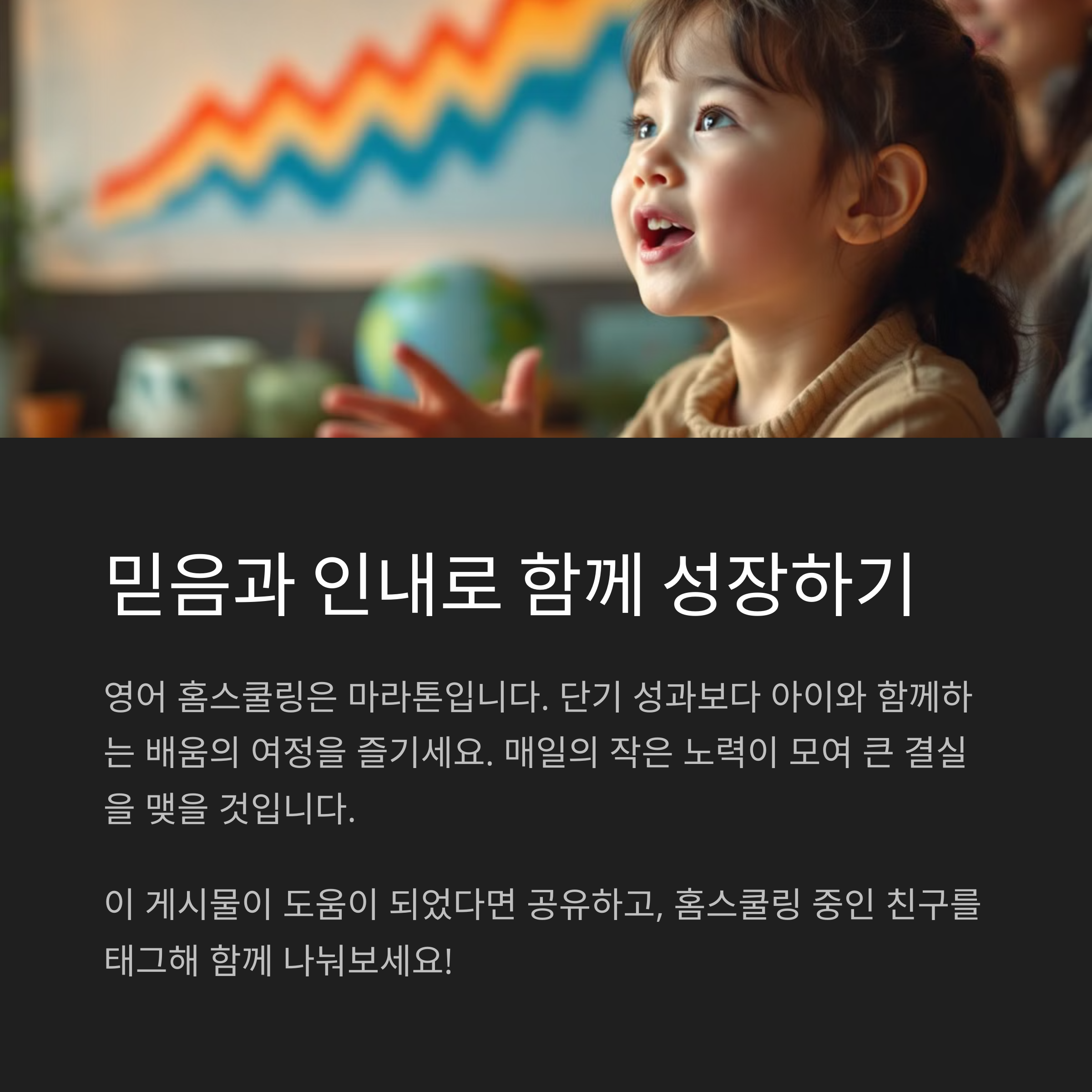 아이 영어 홈스쿨링은 부모의 인내와 꾸준한 관심이 바탕이 되어야 가능한 교육 방식입니다. 그 어떤 커리큘럼보다 중요한 것은 아이의 특성과 흥미를 반영한 접근이며, 이를 통해 영어가 아이의 일상에 자연스럽게 스며들게 할 수 있습니다. 급하게 결과를 기대하지 마시고, 하루하루 즐겁게 영어를 접할 수 있도록 환경과 분위기를 만들어 주세요. 부모와 함께 성장하는 홈스쿨링은 아이에게도 잊지 못할 따뜻한 기억이 될 것입니다.