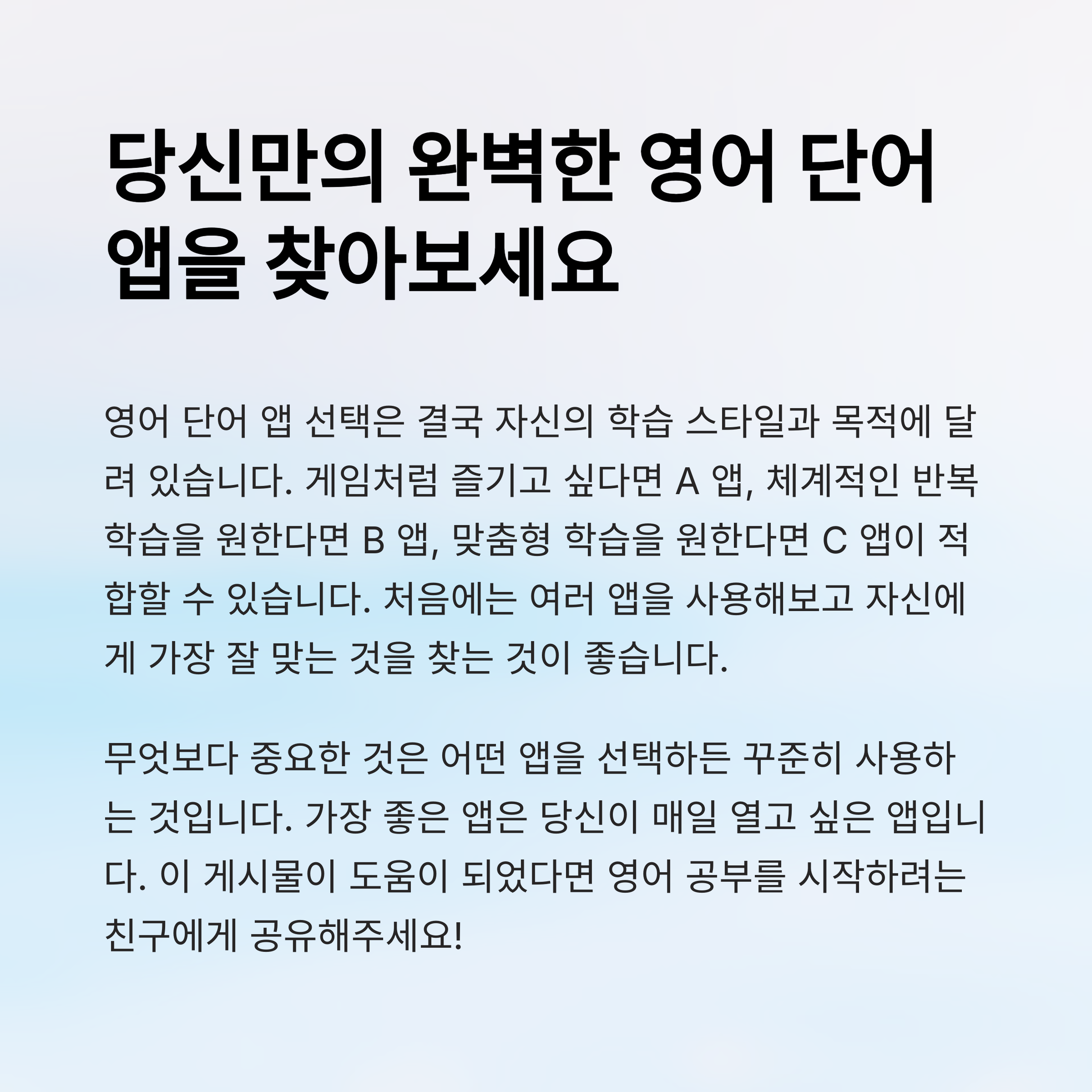 어떤 앱이든 중요한 것은 꾸준함입니다. 기능이 아무리 좋아도 하루 이틀로 끝나면 효과는 없습니다. 본인의 목표와 학습 패턴에 맞는 앱을 정하고, 매일 10~15분씩 꾸준히 학습하는 것이 가장 이상적인 방식입니다. 어휘력은 단기간에 완성되지 않으며, 반복과 노출을 통해 점진적으로 향상됩니다. 자기 주도적 학습을 도와줄 수 있는 앱을 찾는 것이 핵심입니다.