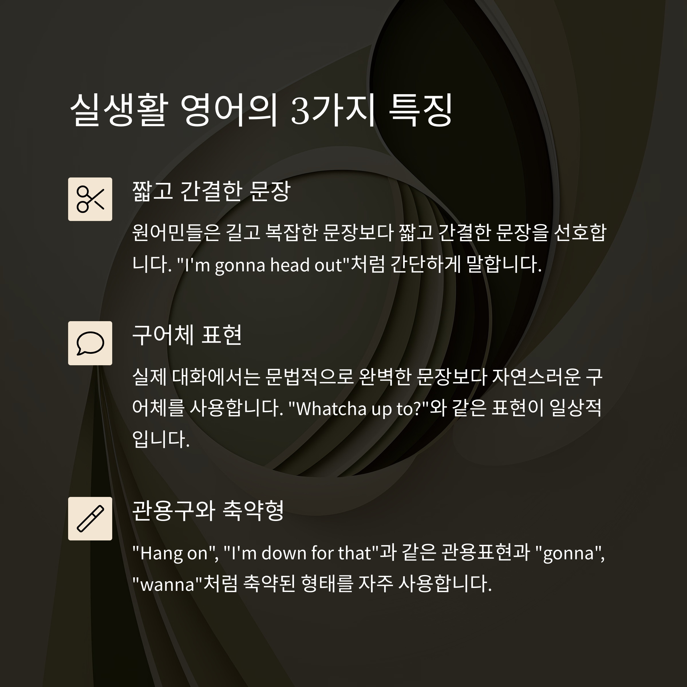 실제 대화체를 자주 들을 수 있는 영상 콘텐츠는 생활영어 학습에 매우 효과적입니다. 자막과 함께 보며 따라 말하는 연습이 중요합니다.