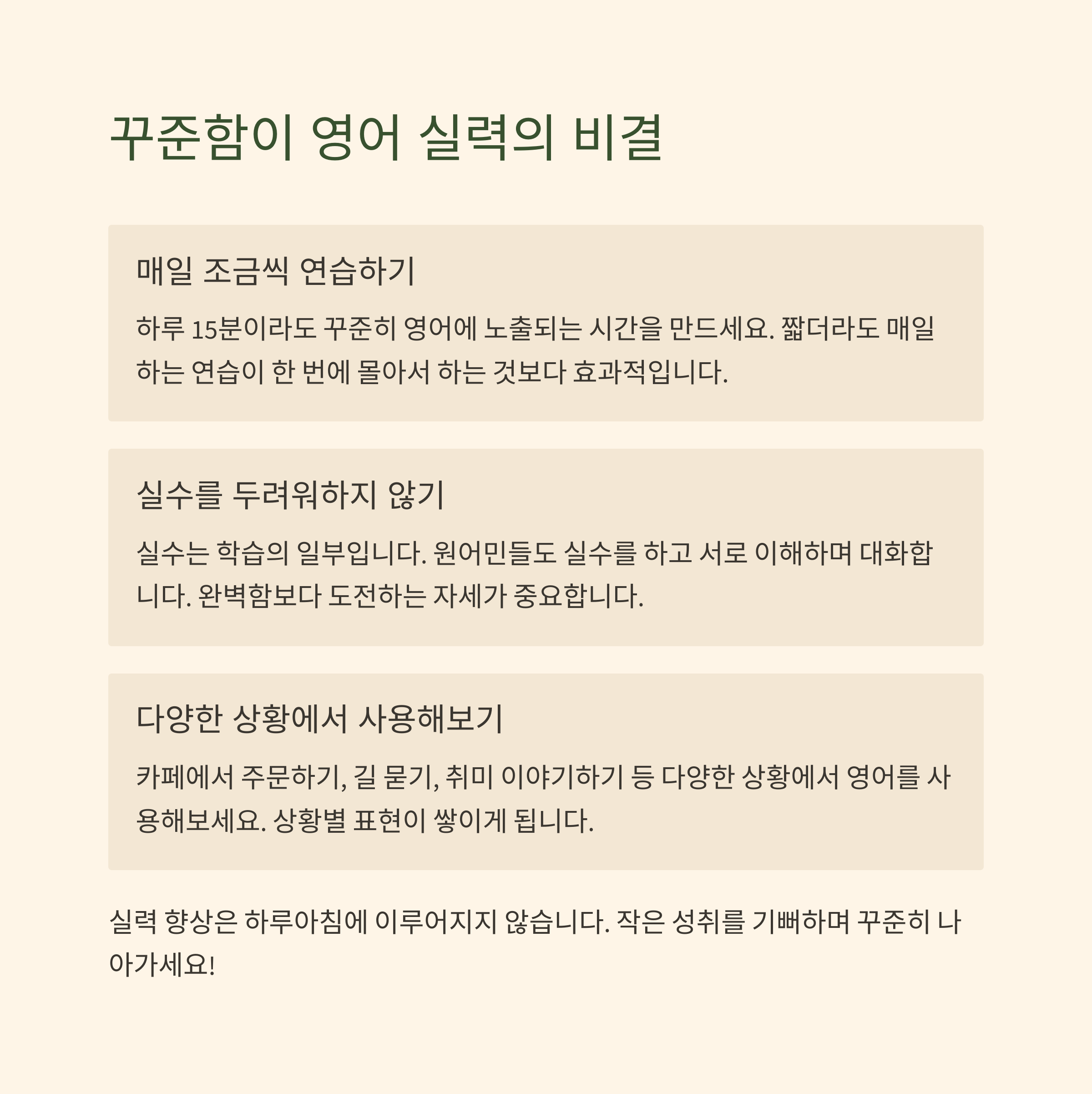 영어는 더 이상 교실 속 언어가 아닙니다. 이제는 우리가 실제로 살아가는 공간, 일상 속에서 자연스럽게 활용되는 생생한 커뮤니케이션 수단입니다. 단어를 외우고 문장을 암기하는 시대는 지났습니다. 중요한 것은 자주 듣고, 자주 말해보는 것, 그리고 그 속에서 실수를 두려워하지 않고 표현해보는 태도입니다. 오늘 소개한 생활영어 팁들을 바탕으로 여러분도 자신의 영어 감각을 조금씩 키워나가길 바랍니다. 완벽한 문장보다 중요한 것은 상대방과 소통하려는 진심입니다. 자신감을 가지고 오늘 배운 표현 하나만이라도 실제로 사용해보는 것, 그것이 진짜 영어의 시작입니다.