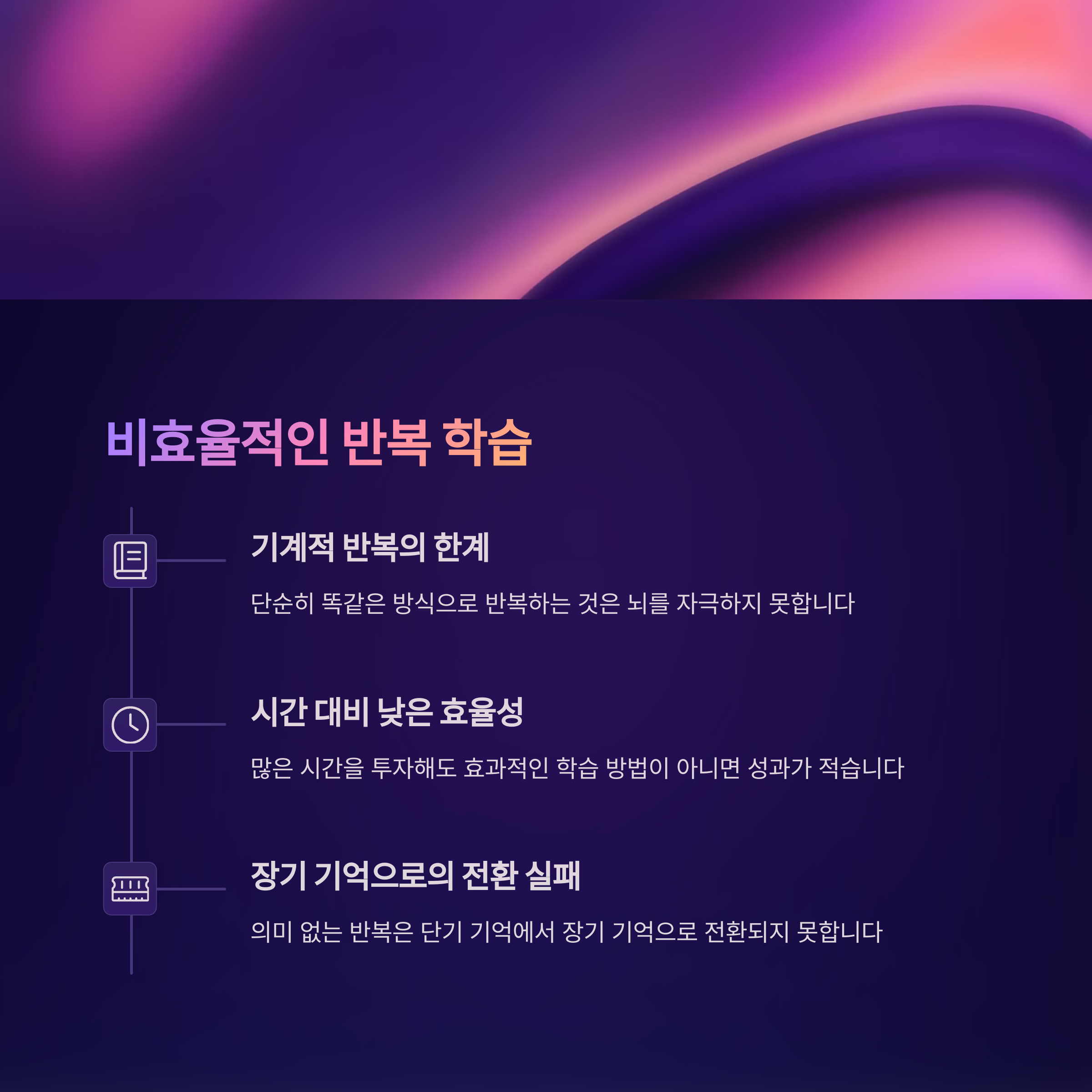 단기 기억 용량은 매우 제한되어 있으며, 부담이 크면 정보가 사라집니다. 단어를 꺼내 쓰려면 연결된 맥락과 단서가 함께 있어야 합니다. 반복 시간 간격을 조절해 암기의 효율을 극대화하는 기법입니다.