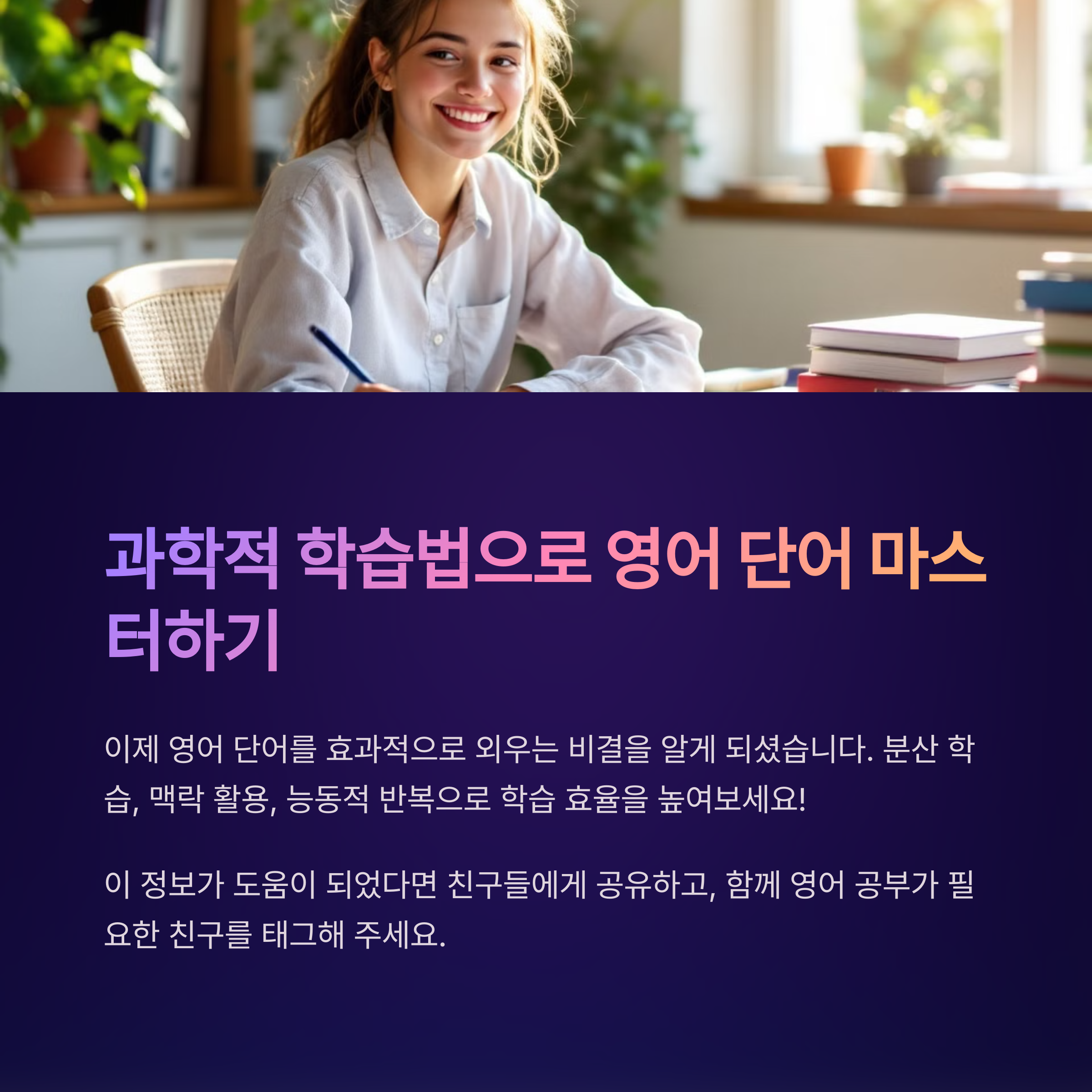 영어 단어 암기는 단순한 반복만으로는 한계가 있습니다. 우리의 뇌는 정보를 구조화하고 맥락 속에서 의미를 부여할 때 비로소 그 정보를 오래 기억할 수 있습니다. 이번 글을 통해 과학적으로 입증된 기억 메커니즘을 이해하고, 실제 학습에 적용할 수 있는 팁을 얻으셨기를 바랍니다. 여러분의 학습 여정이 보다 과학적이고 효율적으로 변화하길 응원합니다.