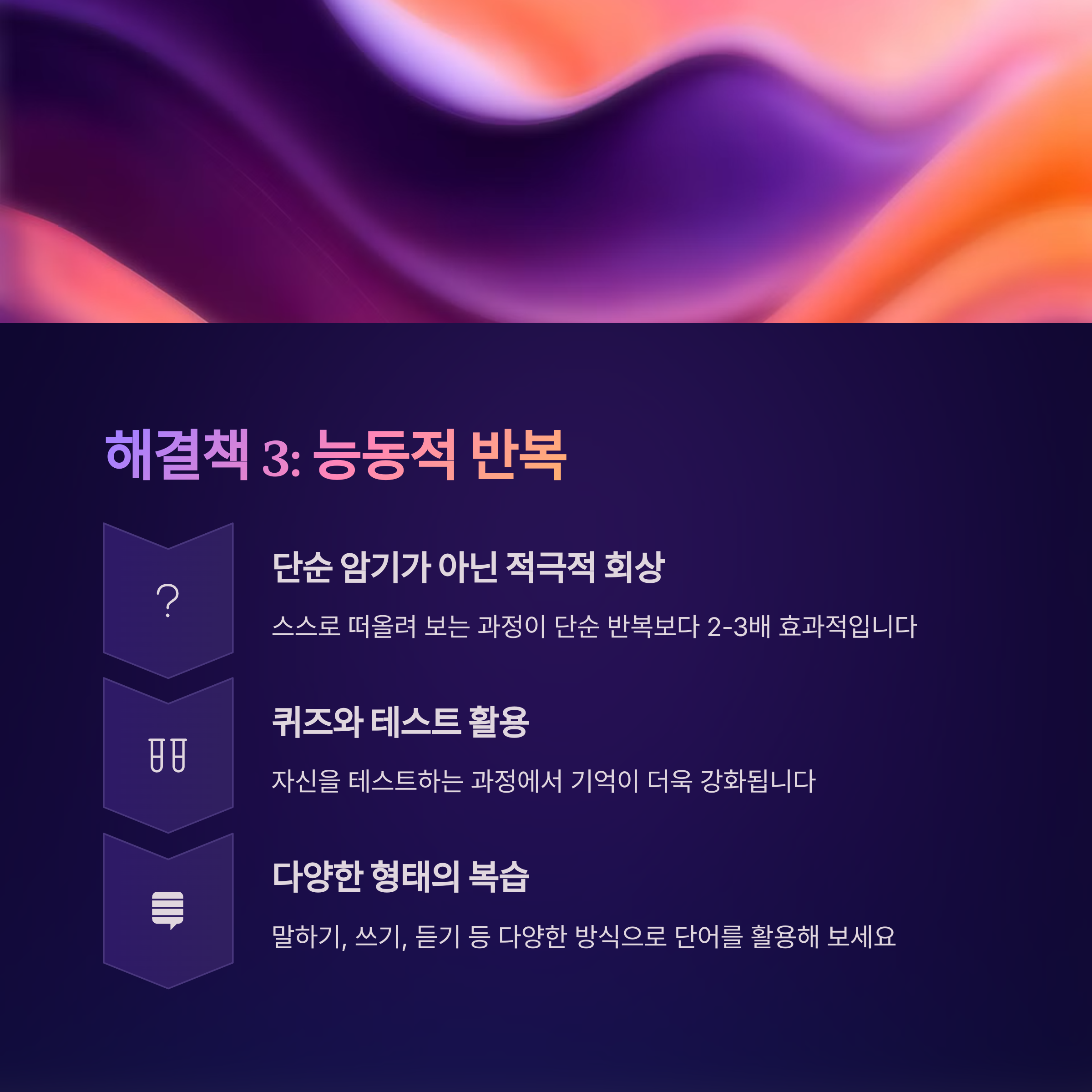 분산 반복 학습법과 소리내어 말하기, 문장 속 활용 연습을 병행하는 것이 가장 효과적입니다.