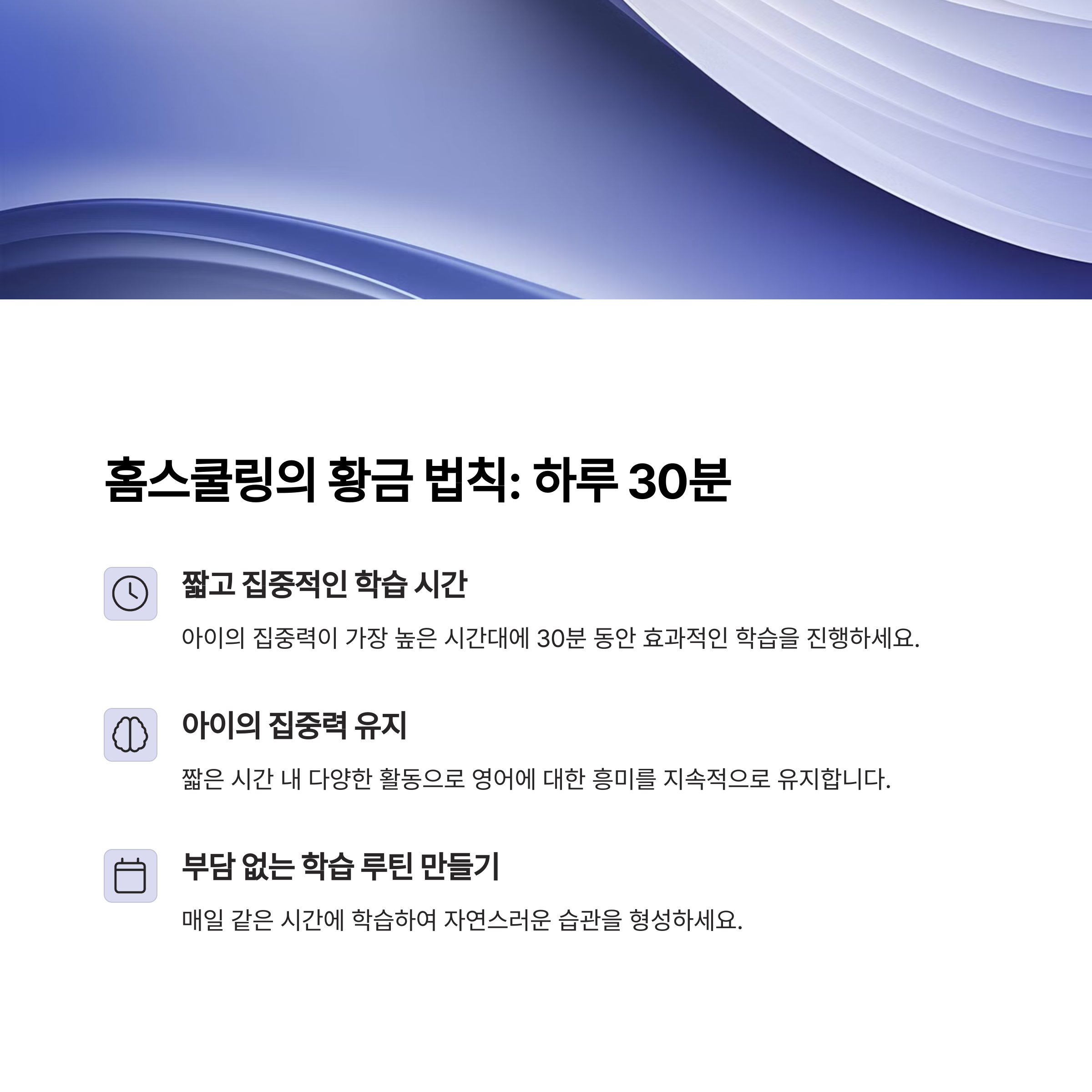 영어 홈스쿨링을 처음 시작하려는 부모님들이 가장 많이 고민하는 부분은 '과연 우리가 이걸 지속할 수 있을까?'라는 현실적인 질문입니다. 아이가 매일 영어를 듣고 말할 수 있도록 유도하는 건 생각보다 어려운 일입니다. 하지만 중요한 건 ‘매일 조금씩’의 힘입니다. 하루 10분 동화 듣기, 10분 영어 놀이, 10분 말하기 연습처럼 짧지만 반복 가능한 구조로 루틴을 구성하면 아이도 지치지 않고 즐겁게 학습할 수 있습니다. 부모 역시 부담이 적기 때문에 지속성이 높아집니다. 무엇보다 ‘함께 하는 시간’이 영어를 재미있는 기억으로 남게 만듭니다.
