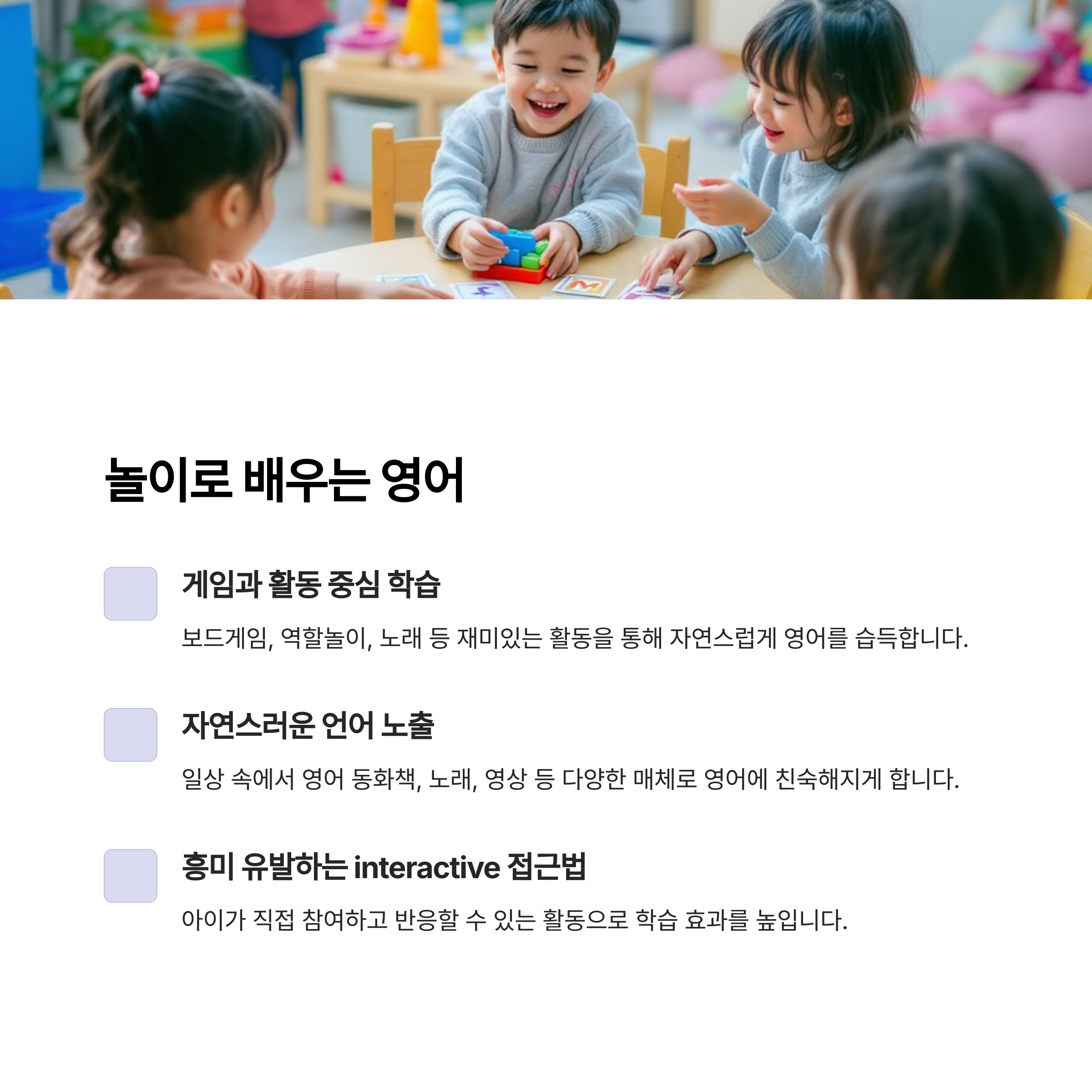 아침-중간-저녁을 나눠 구조화된 루틴을 만드세요. 노래, 동화, 영상 등 다양한 방식으로 반복 노출합니다. 매일 30분, 짧고 쉽게 시작하세요.