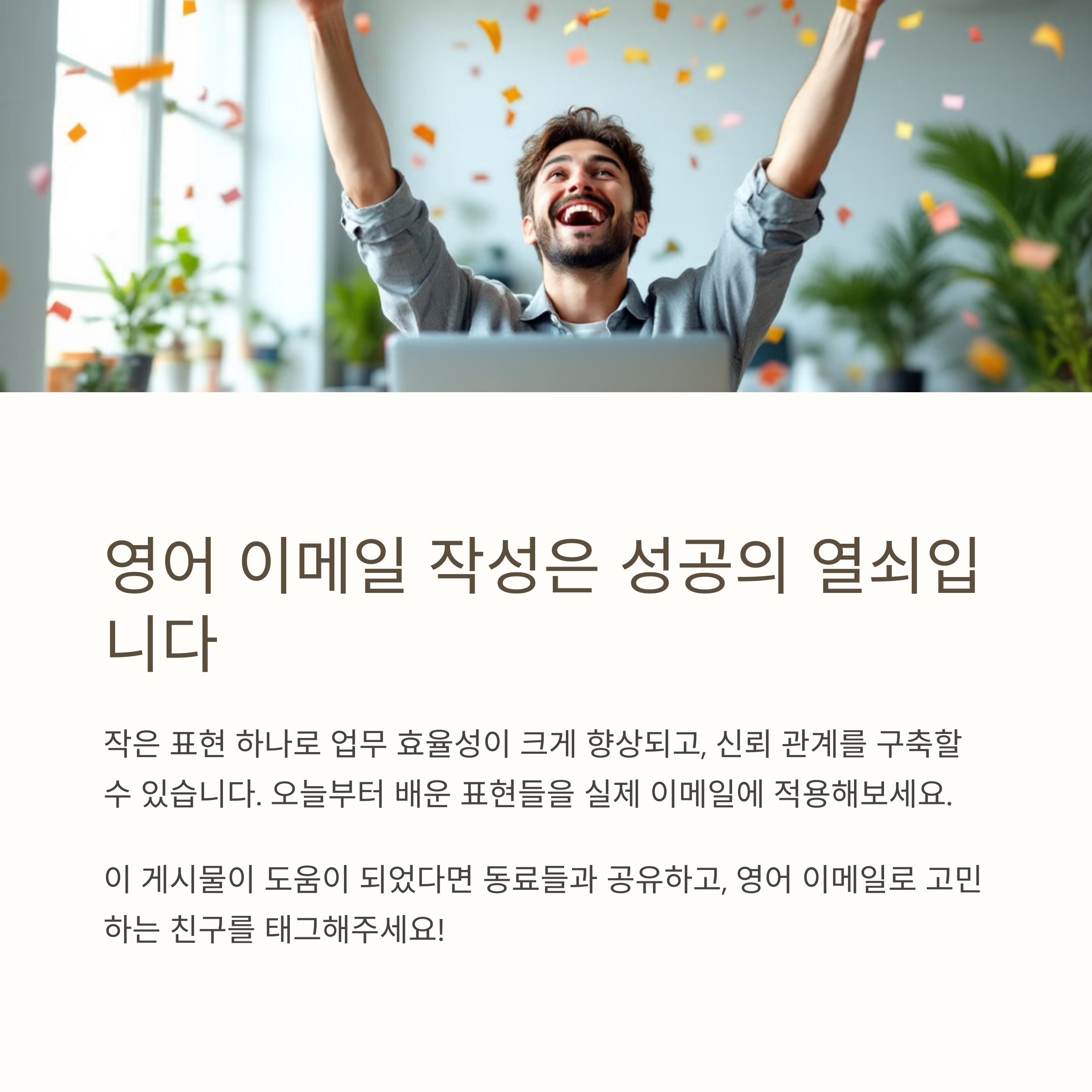 영어 이메일은 단순히 언어의 문제가 아니라, 상대방과의 신뢰를 쌓는 중요한 커뮤니케이션 수단입니다. 오늘 소개해드린 팁들을 기억하고, 업무 상황에 맞는 표현을 잘 활용해보세요. 반복해서 작성해보면 어느 순간 자연스럽고 정확하게 자신의 의사를 표현할 수 있게 됩니다. 지금 이 글을 읽고 계신 여러분도 충분히 비즈니스 영어에 자신감을 가질 수 있습니다. 이제부터는 메일을 쓸 때 두려워하지 말고 내가 전달하고 싶은 바를 간결하고 정중하게 적어보세요. 작은 변화가 여러분의 커리어에 큰 차이를 만들 수 있습니다.