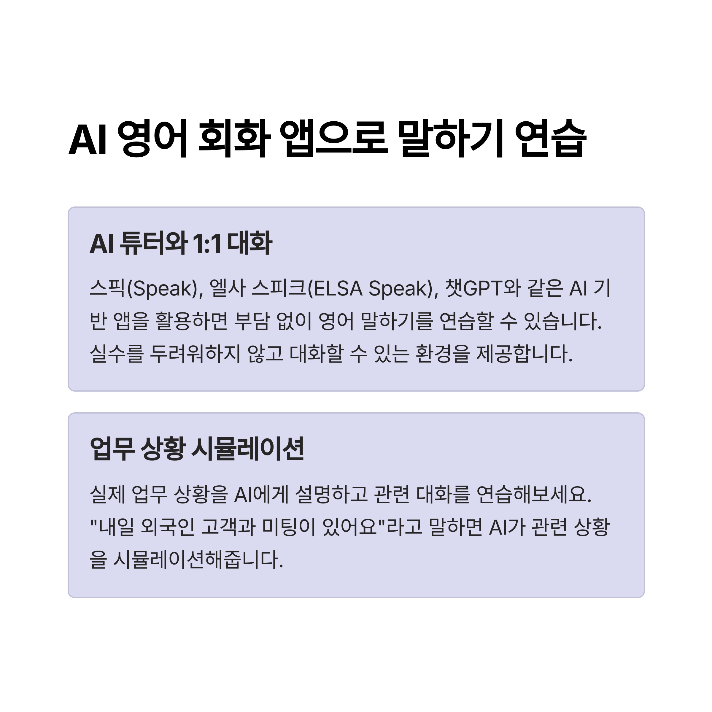 영어는 무작정 외우기보다는 ‘활용’을 목표로 해야 합니다. 예를 들어 업무에서 자주 쓰이는 이메일 문장, 회의 표현, 자기소개나 프로젝트 설명 같은 부분부터 연습하면 바로 사용할 수 있기 때문에 동기 부여도 높아집니다. 또한 AI 회화 앱이나 채팅봇을 통해 직접 말해보는 연습을 병행하면 자연스럽게 말문이 트이기 시작합니다. 매일 1~2문장씩이라도 반복해서 말하면, 말하기 실력은 분명히 향상됩니다.