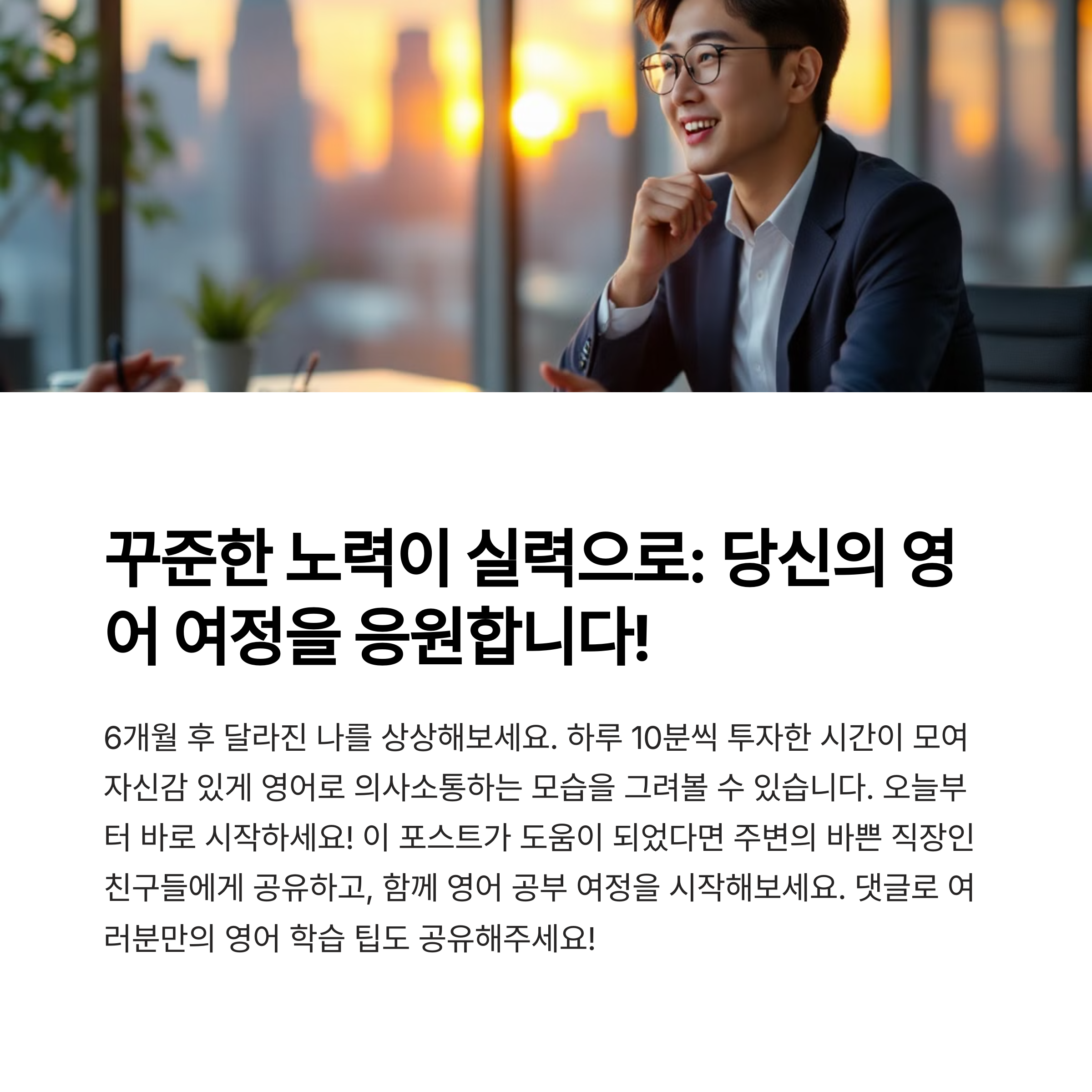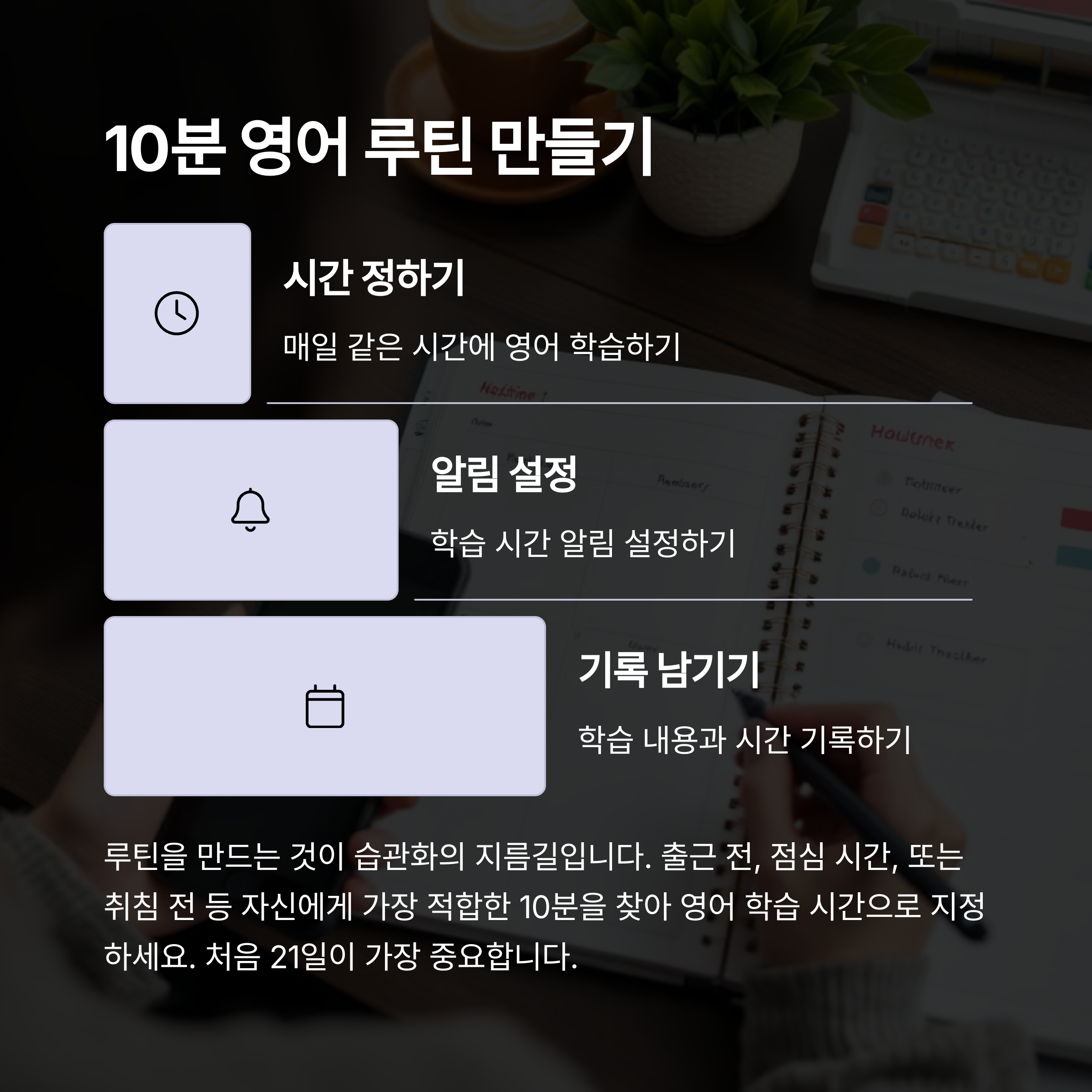 영어는 더 이상 선택이 아닌 필수인 시대입니다. 그러나 그 중요성을 알면서도 시간 부족으로 인해 시작조차 어려운 분들이 많습니다. 중요한 건 완벽한 계획보다 하루 10분의 실천입니다. 매일 조금씩이라도 영어에 노출되고, 일상 속에서 활용 가능한 표현을 연습해보세요. 오늘부터라도 짧은 시간, 꾸준한 루틴으로 여러분만의 영어 근육을 키워보시길 바랍니다.